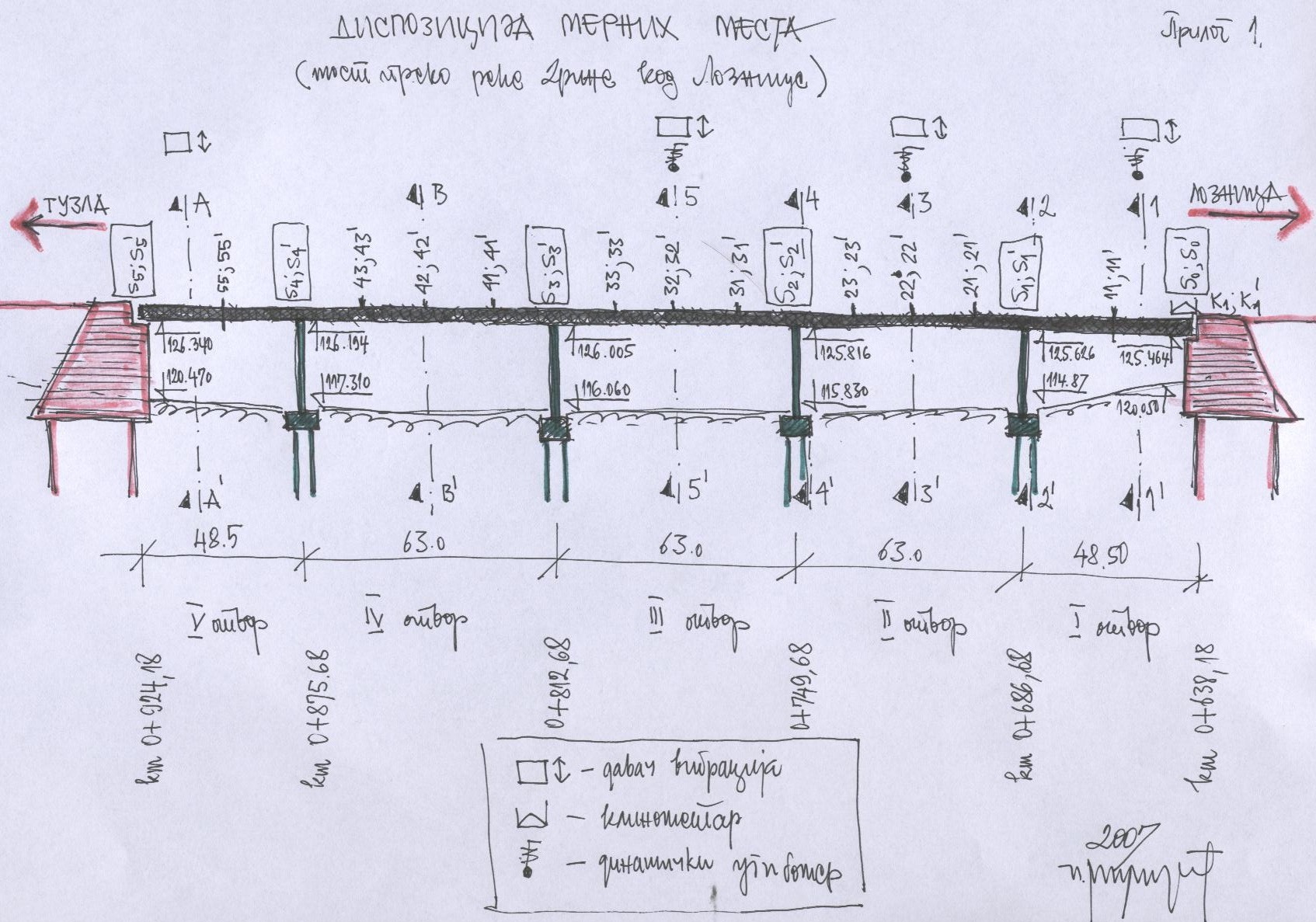 ИММ: Диспозиција мерних места - подужни пресек моста