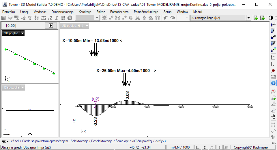 На основу утицајних линија за померања приказују се максималне вредности вертикалних померања са критичним (опасним) положајем покретног оптерећења у оба поретка.