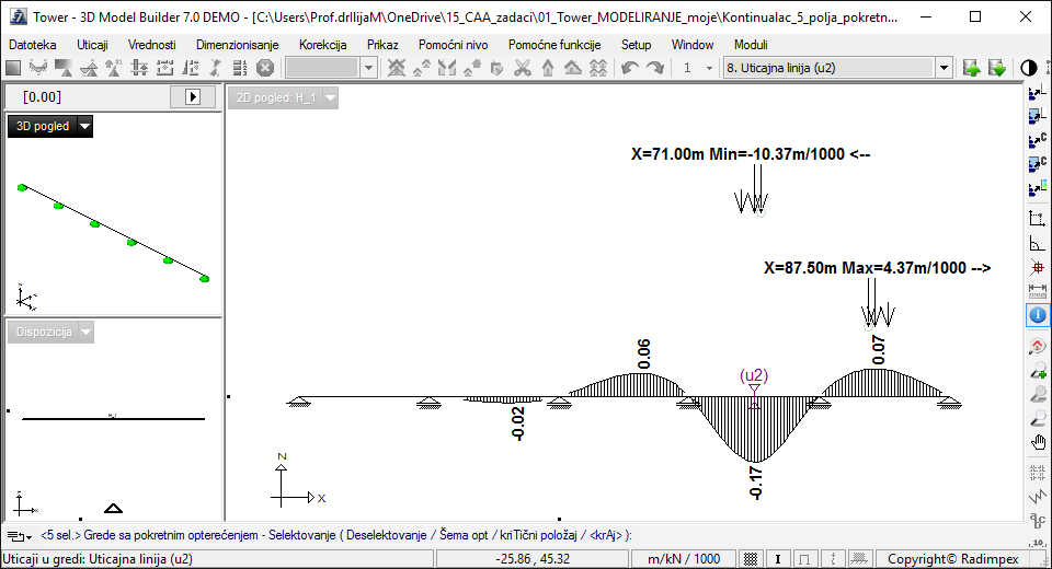 Утицајна линија за вертикално померање. |5_поље - средина распона|