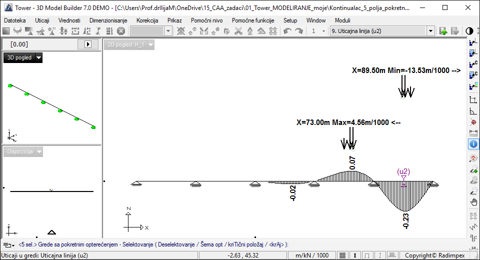 Спроведеним рачунарским симулацијама су поређењи резултати са могућностима које дају утицајне линије за вертикална померања у половинама распона система континуалног носача са пет поља.